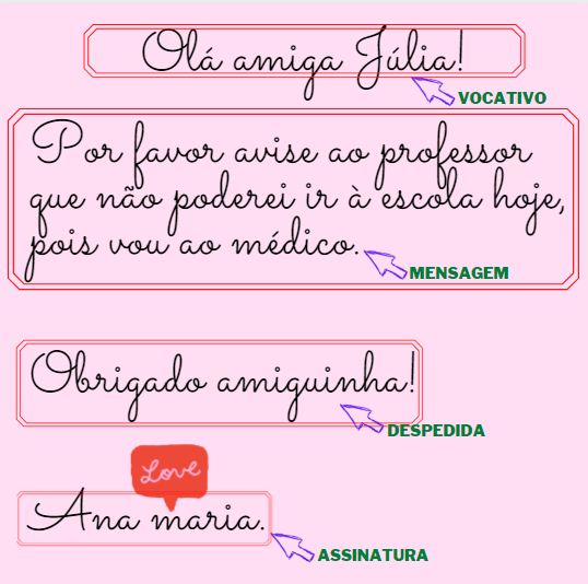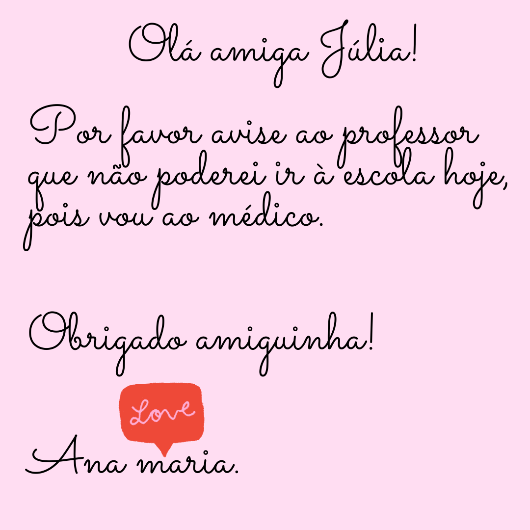 1) Escreva um bilhete para o professor de Língua Portuguesa avisando que você irá faltar à aula no dia da avaliação. O motivo é uma consulta médica que estava previamente marcada. Use a estrutura do gênero bilhete (leia texto novamente).